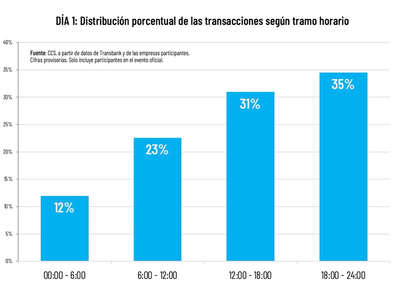 La jornada estuvo marcada por un notable incremento en la intensidad de las ventas a medida que avanzaba el día. Más de un tercio de las transacciones se realizaron entre las 18:00 y las 24:00 horas, siendo las 22:00 el horario peak, concentrando el 7,1% de las transacciones, seguida por las 21:00 (6,5%) y la tradicional primera hora del evento (5,8%). Durante la madrugada del martes, se sumaron 180 mil transacciones adicionales, equivalentes a poco más de US$ 14 millones.