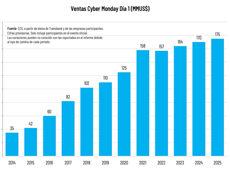 Santiago, 07 de octubre de 2025.– El primer día de CyberMonday 2025 cerró con cifras históricas, consolidando su posición como el evento más importante del comercio electrónico en Chile. Según datos entregados por la Cámara de Comercio de Santiago (CCS), los montos totales de ventas alcanzaron US$ 175 millones, representando un aumento del 9% respecto al año anterior y el registro más alto en los 15 años de historia del evento.